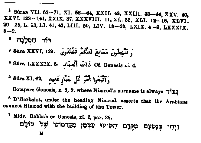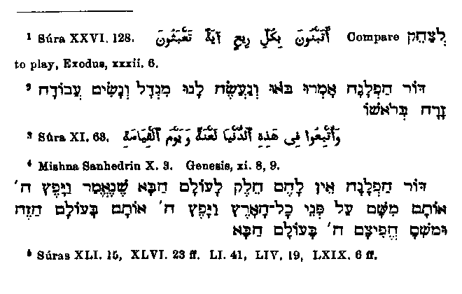 pass when they journeyed from the beginning (East), that is to say, when they withdrew themselves from Him Who is the beginning of the world." Muhammad says of these people1 that they built an (idolatrous) symbol on every high place in order to play there (i.e. to practice idolatry). And the Rabbis tell us2 that the race of the dispersion contemplated building a tower and putting an idol on its summit. Resemblances are also to be found with reference to the punishment which overtook them. Muhammad tells us3 they were followed in this world by a curse, and that they shall be followed by the same on the day of resurrection, and the Rabbis say4 that the race of the dispersion had no part in the next world, for the twice-mentioned dispersion applies to this world and the other. In Muhammad's treatment the essential point of the punishment is lost sight of, for instead of describing it as a simple dispersion and confusion of tongues, he speaks of an absolute annihilation of the sinners by a poisonous wind.5 One sees at once the mistaken source from which this change is derived. We recognize partly from our knowledge of Muhammad's motives in making the alteration, and partly from the minuteness with which