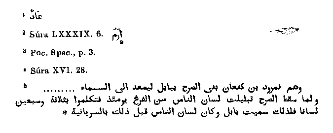 Quran the people of Ad1. The commentators state that Ad was the son of Uz, the son of Aram, the son of Shem, the son of Noah; and Muhammad seems also to have been of this opinion, whence it comes that he transfers the events to the land of Aram or Iram.2 Nevertheless it seems to have come about chiefly from the fact that all those occurrences are described with an Arabian colouring, and so they were attributed to Arab tribes, amongst which an ancient extinct one had the name of Ad3 perhaps in it there is also an etymological reference to a "return" to the early evil conduct of the generation of the Deluge. In another passage there is an allusion to this occurrence,4 where the fact itself is brought forward much more in accordance with the Biblical account, but quite without specification of time or persons: "Their predecessors devised plots heretofore, but God came into their building to overthrow it from the foundation, and the roof fell on them from above and a punishment came upon them which they did not expect." On this Elpherar remarks:5 "These are Nimrod, the son of Canaan, who built a tower in Babel in order that he might mount to heaven"; and further: "And when the tower fell the language of men became confused, and so they could not finish it; then they spoke seventy-three languages, on this account the city was called Babel (confusion), before this the language of men was Syriac." The Rabbis, too, assert that before this