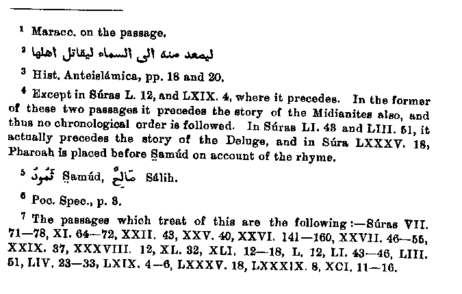 Perhaps Muhammad was misled by the analogy of the wife of Lot, who is mentioned in the same context. While these variations are fine to errors and to the confusion of different times and events, others are to be ascribed to deliberate1 alteration and elaboration. And of this kind are those details not mentioned in Jewish History, which represent Noah as one occupying the same position as Muhammad and speaking in his spirit. This applies particularly to that which is put into his month as admonisher. This is the case not only with Noah, but with all who appear in the character of the righteous in any evil age. Thus he puts into the mouth of Luqman, as a wise man known to the Arabs,2 words suitable to his own circumstances and opinions, and the same thing happens in the case of Noah and the other preachers of Jewish history to whom he alludes. Noah, though he worked no miracle, was saved in a miraculous way, and so Muhammad cannot put into his mouth the same words which he uses of himself, as well as ascribes to other forerunners of himself after Noah's time, viz., that he is a mere preacher; yet be makes him say everything which is not clearly contrary to the historical facts related about him. He was only an unimportant man,3 and did not pretend to be anyone wonderful or supernatural.4 But he was divinely commissioned to warn the people, and for this he asked no reward.5 O sancta simplicitas! one would exclaim in considering this last point, if Muhammad had written it down with fall consideration of Noah's position as one threatening the world with punishment, and if it had not been rather that he saw everything from his own distorted point of