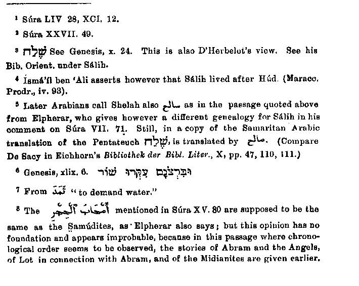 men spoke in Hebrew, but afterwards in seventy languages. Jalalu'd-din says the same thing,1 and adds that Nimrod built the Tower "in order that be might mount out of it into heaven to wage war with the inhabitants thereof."2 But the identity of this narrative with that of Hud and Ad is no more accepted by Abulfeda3 than it is by Elpherar and Jalalu'd-din, even on the view that Hud is the same as Eber. Although the colouring of this narrative as given in the Quran differs much from that of the Biblical account, yet the identity of the two can be shown by putting this and that together, and by explaining the way in which the individual differences arose. But in the case of another narrative which follows this one in almost all the passages of the Quran,4 it is very difficult to find out the subject of which it treats and the Bible characters to which it refers. This narrative is about Samud5 which like Ad is an ancient extinct Arab tribe,6 to whom their brother Salih was sent when they fell into sin. Salih is said to have exhorted the Samudites to righteousness and to have commended to them a certain she-camel as especially under divine protection;
