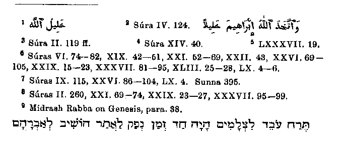 Though the saints mentioned earlier bore some likeness to Muhammad, and though their condition, so similar to his own, encouraged him as well as verified his statements, yet Abraham was his great prototype, the man of whom like thought most history, and the one with whom he liked best to compare himself and to make out as one with himself in opinion. Abraham's faith2 is that which is preached in the Quran.3 He was a believer in the unity of God.4 He was neither Jew nor Christian for it is written:5 "Abraham was not a Jew, nor a Christian, but be was a believer in the unity of God, given up to God (a Muslim)."6
