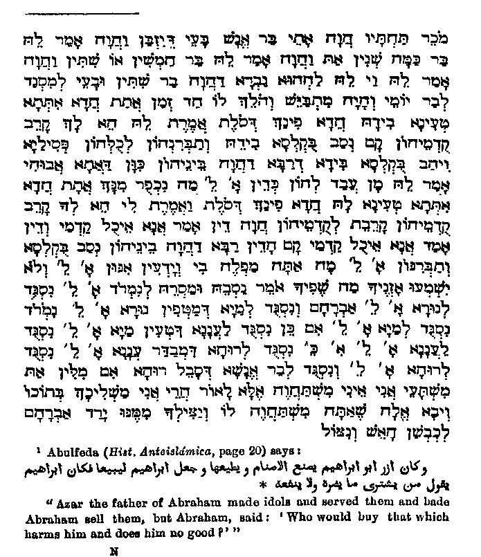 idols, and put the stick into the hands of the largest idol when his father returned, he said, 'Who has done this?' On which Abraham replied, 'Why should I deny it?, A woman came with a dish of wheat and bade me set it in front of them. I had scarcely done so when each wanted to eat before the other, and the greatest beat them all down with the stick which he had in his hand. Terah said: 'What art thou inventing for me? Have they then understanding?' Abraham replied, 'Do thine ears not hear what thy month says?' Then Terah took him and gave him over to Nimrod, who said: 'We will worship fire.' Abraham said: 'Rather water, which extinguishes.' Nimrod replied: 'Water then.' 'Rather the cloud which carries water.' 'The cloud then.' 'Rather the wind which scatters the cloud.' 'The wind then.' 'Rather men, who endure the wind.' Nimrod at this became angry and said: 'Thou art only making a speech. I worship fire and will throw thee into it. The God whom thou dost worship may come and save thee out of it.' Abraham was then thrown into a glowing furnace, but was saved from it." The intercession for his father is not mentioned in Jewish writings; and that this was fruitless, yea that Abraham, arriving at a clearer understanding, desisted from his attempt,1 seems to directly contradict the Jewish view as expressed in the following passage.2 "By the words, thou shalt go to thy fathers in peace, it was shown to Abraham that his father was a partaker in eternal life." Farther, a Rabbinical saying3 declares as a general rule that "the son makes the father clean, but not the father the son." But Muhammad very often combats