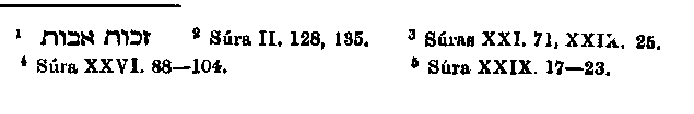 address of God (or Gabriel) to Muhammad.1 This view renders it unnecessary to adopt the desperate expedient of Wahl, who supposes a transposition of verses, or an interpolation. The true explanation is rather Muhammad's entire identification of Abraham with himself. Further, he is not content with making Abraham preach against idolatry, he represents him also as teaching the doctrine of the Resurrection of the dead.2 The lack however of full certainty abont this doctrine3 caused Abraham, according to the Muhammadan view, to pray for a tangible proof of it, and then was vouchsafed to him what the Rabbis called the "covenant between the divided pieces."5