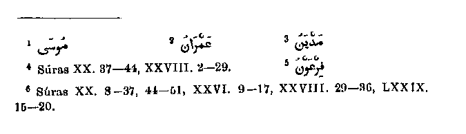 ages; therefore Muhammad adopted from it only such legends as were edifying in themselves and to which he could append pious reflections. In the period of which we are now going to treat, there is certainly still a long array of legends, but historical facts are preserved for us with greater distinctness and clearer detail, and these facts are of greater religions importance. The giving of the Mosaic Law and the eventual life and noble personality of Moses himself afford Muhammad plenty of material for his narrative. Here we will first put together the whole life of Moses as represented in the various passages of the Quran, and then we will go on to consider the details to be commented upon. Among the oppressive enactments of Pharaoh against the children of Israel was an order that their children should be thrown into the water. Moses1 the son of Amram2 was laid by his mother in an ark; Pharaoh's wife, who saw the child there, saved it from death and had it nursed by its mother. When Moses was grown up he tried to help his oppressed brethren, and once killed an Egyptian; the next day however he was reminded by an Israelite of his yesterday's deed. This made him afraid, and by the advice of a friend he fled to Midian,3 and married there the daughter of a Midianite.4 When he wished to leave Midian he saw a burning bush, approached it, and received a command to go to Egypt to warn Pharaoh5 and to perform some miracles to make him believe; he asked for his brother Aaron as an assistant in this work.6 He obeyed the command and accomplished his mission, but Pharaoh remained unbelieving and assembled his magicians, who