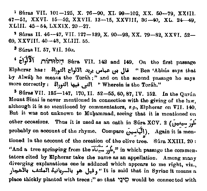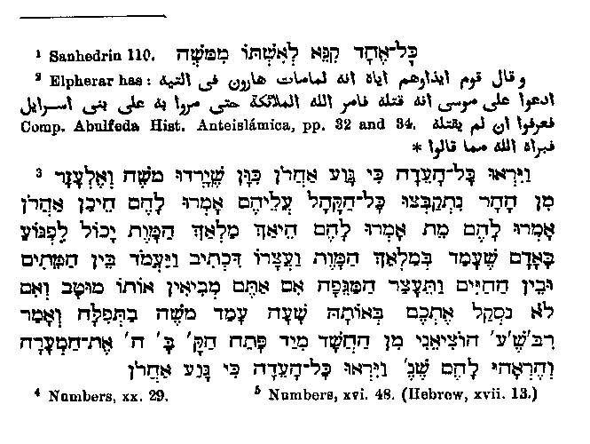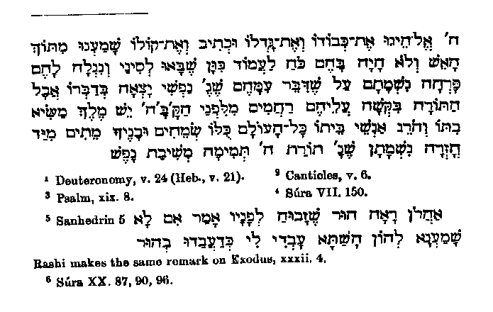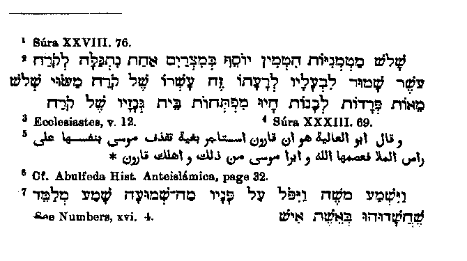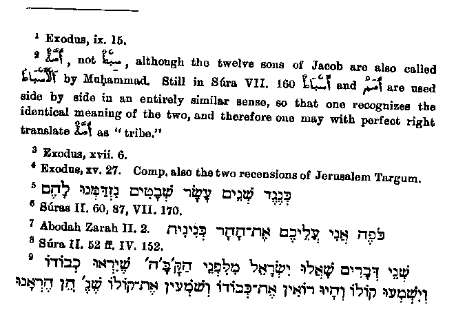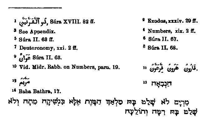 Of the individual laws which are mentioned historically in the Quran,3 only one, viz that relating to the red hefer,4 affords material for a narrative, and that is given5 in very unnecessary fullness and with manifold errors. In the first place Muhammad confounds the red heifer6 with the calf which is slain for one murdered by an unknown hand,7 and he also makes the dead man live again8 on being struck with a piece of the animal. In view of such great distortions we must not deal hardly with him for the following small one; he says that the cow must be of one year,9 in contradiction to the rabbinical statement that she had to be a two-year old.10