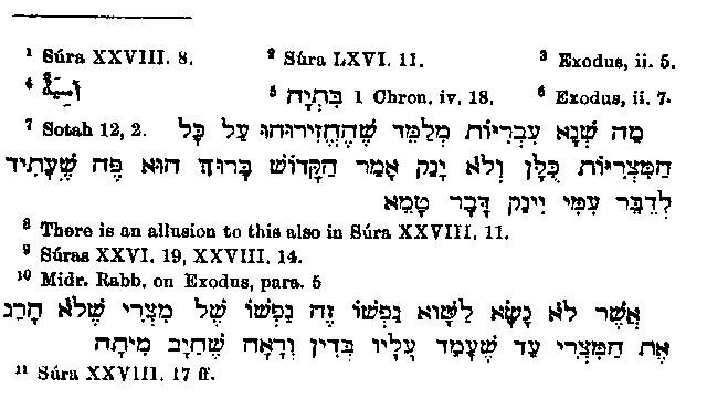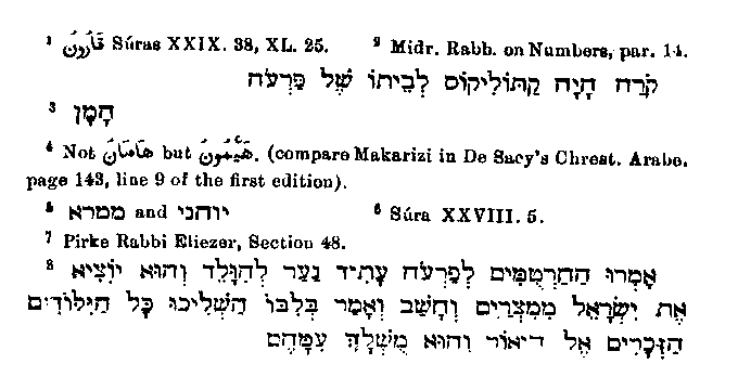 and Korah1 are mentioned as counselors of Pharaoh and persecutors of the Israelites. The latter is alluded to in this capacity by the Rabbis,2 who say "Korah was the chief steward over Pharaoh's house." As to the former, Muhammad must at gone time have heard him mentioned as the Jew's enemy,3 and therefore have put him in here, although later Arabians do not thus designate the Haman4 who lived in the time of Ahasuerus. The Rabbis also say a good deal about Pharaoh's advisers, amongst whom they sometimes mention Balaam, Job and Jethro. Of these the first agreed with Pharaoh and for this reason he was afterwards killed by the Israelites; the second remained silent, therefore he had to endure sufferings; the third fled, and so the happiness of being the father-in-law of Moses fell to his lot. The two chief magicians,5 who are also mentioned in a letter of the apostle Paul, are specially named as abettors. Fear on account of some dream6 is given as the greatest cause of persecution; and this is in accord with the statement of the Rabbis that it was foretold to Pharaoh by the magicians7, that a boy would be born who would lead the Israelites out of Egypt; then he thought, if all male children were thrown into the river, this one would be thrown with them.8 The finding