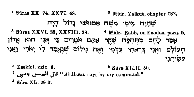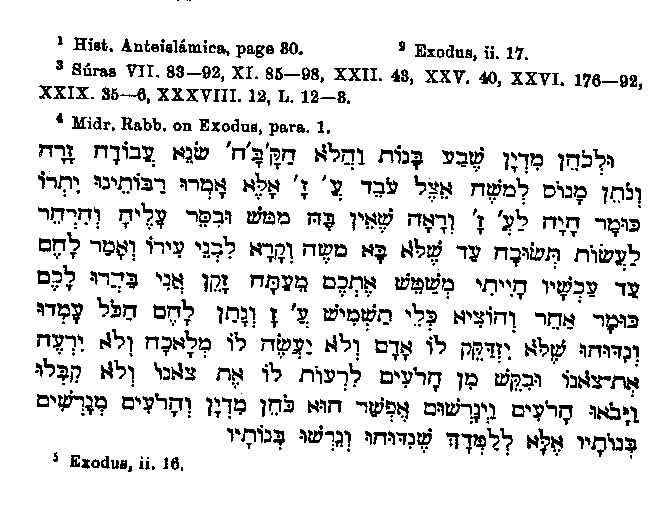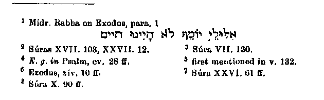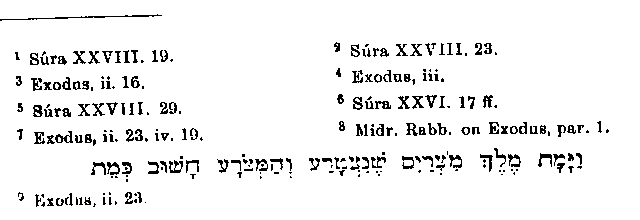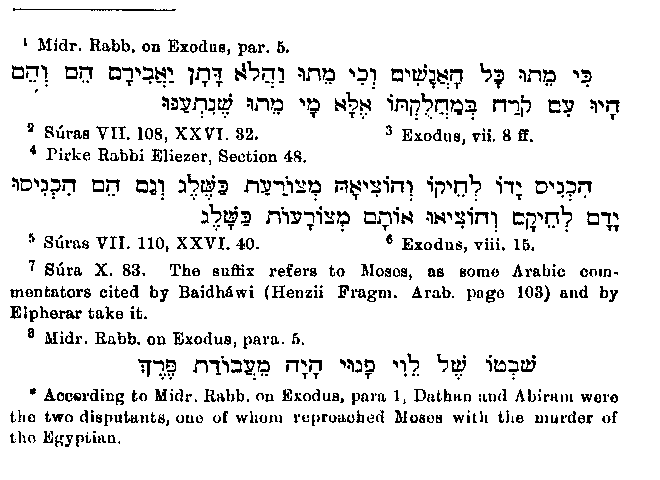 for his quarrelsome temper is mere embellishment, as is also the very happy invention of a man who warned Moses to flee.1 There is a mistake to be found in the very brief account of Moses' flight to Midian and his residence there, for Muhammad speaks of two2 instead of seven3 daughters of the Midianite. Instead of letting the vision in the bush be the occasion of Moses' leaving Midian, as it is in the Bible,4 Muhammad erroneously makes out that Moses had formed the resolution to leave the country before this event, and that the vision appeared to him on the way.5 The appearance of Moses before Pharaoh is connected in a remarkable way with the divine commission to the former. So closely are the two circumstances bound together that in many places Pharaoh's answer follows immediately upon God's command, without its having first been mentioned that Moses and Aaron had gone in obedience to God to Egypt, had done wonders before Pharaoh and had admonished him. But on the other hand in those passages where only the admonitions given by Moses to Pharaoh are related, without the preceding events being given, the part elsewhere omitted is of course supplied but as we might expect with changes. Pharaoh is said to have reproached Moses with the murder of the Egyptian.6 This is a very simple invention, which however is contrary to the literal sense of the Scriptures,7 unless we accept the Rabbinical explanation8 of the words, "the king of Egypt died,"9 that is, "he became leprous and a leper is as one dead; "and also of the words, "for all are died who sought