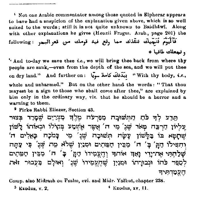 Now we come to a circumstance, which is also taken from Jewish legend, but which has been almost entirely misunderstood, from ignorance of its origin. The passages may be translated as follows: "And we caused the children of Israel to pass through the sea, and Pharaoh and his army followed them in a violent and hostile manner, until when he was drowning, he said: 'I believe that there is no God but He on Whom the Children of Israel believe, and I am now one of the resigned;' on which God said, (or perhaps this is to be read in the first person, so that this verse too expresses Pharaoh's penitence, and the next verse begins the expression of God's answer) 'Thou hast been hitherto one of the rebellious and wicked doers. This