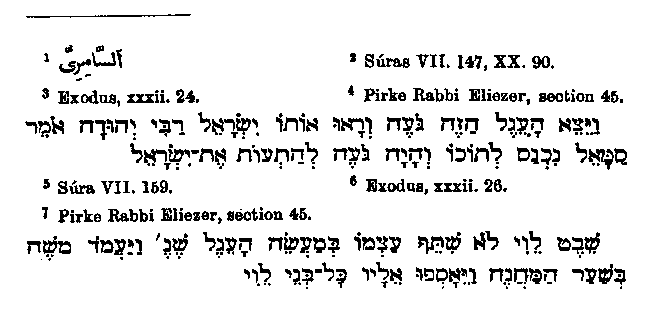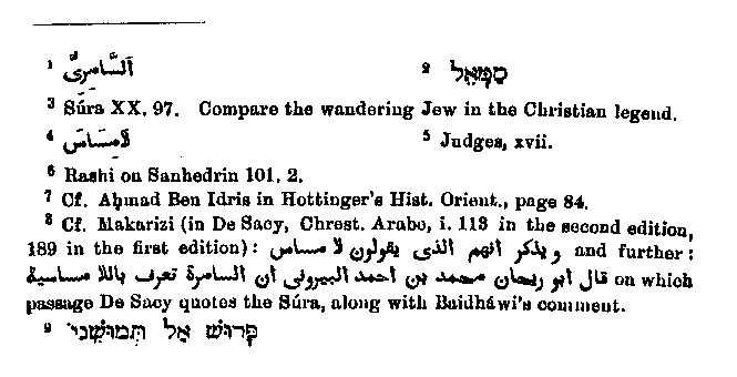 the Israelites, named Samiri,1 led them astray and also made the calf. This arose perhaps from Samael,2 the name of one who is supposed by the Jews to have been helpful at the making of the calf; but at any rate the tale has been differently developed by Muhammad. According to him this was one of the Israelites who was present, and whom Moses condemned to everlasting wandering,3 so that he was compelled to say perpetually, "Touch not."4 One recognises that this legend is composed of different elements. It is not foreign to Jewish tradition that another Israelite, not Aaron, made the calf, and according to one legend, Micah,5 who is mentioned in Judges, helped in the making;6 whence it comes that many Arabians assort that Samiri and Micah are one and the same person.7 Perhaps Muhammad formed the word Samiri from a confusion with the name Samael.