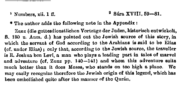 the grave and shewed Aaron to them, and to this refers the passage 'The whole congregation saw, etc.'" Here I omit entirely a third very insipid fable which the commentators mention, and which seems to them to be the most probable occasion of the verse, but I cannot trace it to any Jewish source. The most correct view is, as Wahl has already remarked, that the verse refers to the reproaches of Aaron and Miriam.1 In short the fifth verse of Sura LXI is about the answer of Moses to the disputants. Here the commentators give only the fable not quoted by us, just because here, as in the second passage, they repeat only the most universally accepted view. But this cannot prevent us from holding to our opinion. Of the journey described by Mubammad2 I could not find a trace in Jewish writings, although the colouring is Jewish.* Moses is said to have gone with his servant to see the place where two seas met, and to have forgotten a fish, which they were taking with them for food and which sprang into the sea. When they went back to seek it, a servant of God met them and made the journey with them, telling them before hand that his notions would rouse their impatience. He sank a ship, killed a youth and propped up a wall; and only when they parted did he give sufficient reasons for these actions. The story following this about Dhu'l-