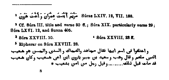to it is to be found in the Quran,) has in it no trace of hostility; and so the conjecture is not too daring that, as a matter of fact, all these three,1 viz., the Midianites, the people of the wood, and the people of the well, are the same, but that Muhammad regarded the first two only as identical and looked on the last as different. Still this tradition seems to have been received even among the Arabs, for we find in Elpherar2 among other explanations the following: Wahb says that the people of the well sat beside it (the well), and the shepherds served idols. Then God sent Shu'aib, who was to exhort them to Islam, but they remained in their error, and continued their efforts to harm Shu'aib. While they sat round the well in their dwellings the spring babbled up and gushed over them and their houses, so that they were all ruined." In like mariner Jalalu'd-din says:3 "Their prophet is called by some Shu'aib, by others differently." This admission of the Arabic commentators strengthens our opinion considerably. Another person of some importance in the Mosaic age is said by some Arabic commentators to be alluded to in the Quran,4 but many others dispute the allusion. Elpherar quotes four different opinions on this passage. The first opinion is that it refers to Balaam, for which he quotes many authorities, and relates the history of Balaam in almost complete accord with the