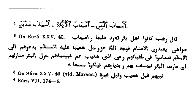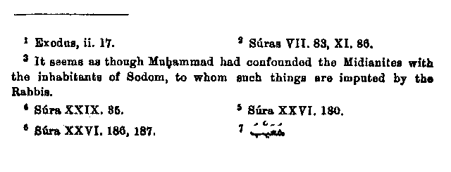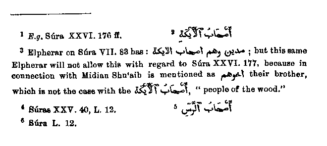 It remains for us to justify the bringing forward of two more passages,4 and it is all the more difficult for us to do so, because in order to prove our point we must accuse Muhammad himself of a misunderstanding. In these passages Shu'aib is not mentioned, but the people who are held up as a warning are called "men of the well,"5 without any other particulars being given about them. But further these "men of the well"6 are mentioned in one passage along with the "men of the wood," and so it seems certain that Muhammad regarded them as two different peoples; but nevertheless we allow ourselves to believe them to be really identical.