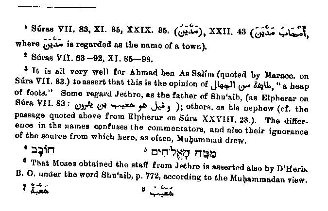 Now if we can find among the Rabbis any intimation favourable to this supposition, then nothing important will remain to oppose its adoption3 as a probable hypothesis. Very little, however, can be adduced to show how Shu'aib and Jethro came to be one and the same person. Muhammad may have confused the name Hobab4 - often used for Jethro and probably pronounced Chobab - with Shu'aib. Perhaps an etymological explanation may be thought of here, for the Rabbis assert that the staff used later by Moses and called the divine staff5 grew in Jethro's garden.6 Now Sha'ba7 means staff and Shu'aib8 may be taken as the possessor of the staff. If Shu'aib is the same as Jethro,