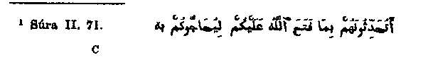 From passages already quoted - to which we might add many others - we gather that there must have been great intimacy between Muhammad and the Jews, leading at times even to mutual discussion of views but this is still more clearly shown in a passage in the Second Sura,1 where the Jews are represented as double faced, professing belief when they were with him and his followers, and then when they were alone saying: "Will ye acquaint them with what God has revealed unto you, that they may dispute with you?" This shows that the Muslims learned the Jewish views from conversation only. We shall speak later of Muhammad's intimacy with 'Abdu'llah ibn Salam, and with Waraka, the cousin of Khadija, who was for some time a Jew, a learned man and acquainted with the Hebrew