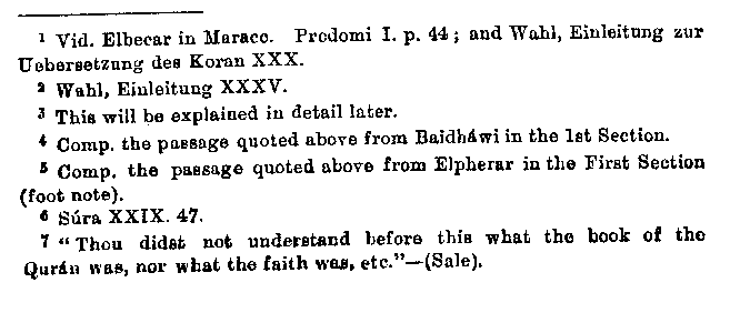 language and scriptures1 so also was Habib ben Malik, a powerful Arabian prince2, who for some time professed the Jewish religion. These all afterwards became followers of the Prophet. Thus Muhammad had ample opportunity of becoming acquainted with Judaism. That his knowledge thereof was not obtained from the Scriptures is clear, from the matter actually adopted, since there are mistakes, which cannot be regarded as intentional alterations, and which would certainly have been avoided by anyone who had the very slightest acquaintance with the sources.3 It is evident also from the low level of culture to which Muhammad himself and the Jews of his time and country had attained. The contempt in which the compilers of the Talmud held the Arabian Jews, in spite of their political power, can be attributed to only by the ignorance of the latter. Though we must not conclude from this that the Jews knew nothing of the Scriptures and, though we hear of schools among them4 and even of their reading the sacred writings in the original,5 still we must doubt, if there was any widely diffused critical knowledge of the Scriptures, and we may be quite certain that Muhammad himself possessed none. Many passages testify to this. First, we may take a passage already quoted,6 where he says he had formerly no knowledge of reading and writing, and then Sura XLII. 52,7 where he denies any previous acquaintance with "the Book" or the "Faith." Even if these are mere figures of speech to prove the divine character of his mission, still it