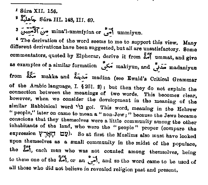 can afford to give up one thing which is generally brought forward as specially proving our point. This is the fact that in certain passages Muhammad calls himself an "'ummiyun,"1 a word which is usually translated "unlearned", or "ignorant." Wahl takes it so, and mentions it as a proof of Muhammad's ignorance. But this word has here the same meaning that is expressed by it in other passages, viz., belonging to the Arabs. It is used like the word "jahiliyat,"2 of the Arabs in their former ignorance of Islam, and Muhammad having risen from among them, thus designates himself3 without reference to his own individual knowledge.4 But, as already stated, even without this proof our conclusion holds good, viz., that because of his own ignorance especially, but also on account of that of the Jews around him, Muhammad could