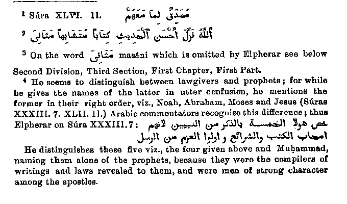 should above all things acknowledge him as a divinely commissioned prophet. He let all that was already established stand good, as is seen from the lists of the prophets quoted above; and he counts it as a point in favour of his Quran that it is1 in accord with the earlier writings recognised by him as revelations. Another time he even says that the Quran is similar to tho earlier religious writings, that it is only a repetition of them, i.e., if I am not mistaken in forsaking the general interpretation and translating the passage Sura XXXIX. 24 2 as follows God hath sent down the most excellent tidings3 a writing like unto others, a repetition." If this is not the meaning, it is incomprehensible how Muhammad could try to prove the superiority of his Quran by pointing to its continual and almost wearisome repetitions. But if his assertion were true, he might gain some advantage by being in accord with earlier revealed writings, and by restoring to their proper position those of them which had been spoiled by additions and perversions, and those which had been too little accounted of. He claims for himself only the same honour which is paid to the other givers of revealed law;4 with this distinction however that he, as the last of the