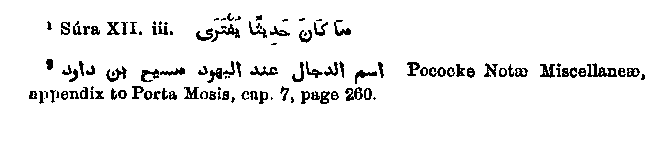 Judaism into his system, but parts only and even these he was obliged to alter and rearrange. In bringing the Jews to his opinion he had to be careful not to alienate others; he could not, therefore, adopt from them such points as stood in complete contradiction to the views of other religious bodies; and so, while he totally excluded some things, he was obliged to elaborate and alter other things with which he could not dispense, in order that they might still be more strong than his own position. Of this he either became aware himself, or others reproached him with it, so that he was forced to assert1 that the Quran is not a new invented fiction. He could not maintain with the Jews that their Law was immutable, for that would have been fatal to his system of religious syncretism; nor could he with them expect a Messiah, because if there were another prophet yet to come, he Muhammad could no longer claim to be the seal of the prophets. This last point was carried so far that the Arabs later on confounded the doctrine of a Dajjal or deceiver, which they had borrowed from the Christians, with the doctrine of the expected Messiah of the later Jews; and the saying existed2 "The name of Dajjal among the Jews is Messiah the son of David." Much in confirmation of what has been stated above will be brought forward in the Second Section of the Second Division, and also in the Appendix.