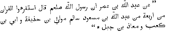 "Abdulla-ibn-'Umr related that the prophet (upon whom be blessing and peace) said, Learn the Quran from these four, Abdulla-ibn-Mas'ud, Salim-mula-ibn-Hazifa, Ubi-ibn-Kab, and M'aj-ibn-Jabal'." From this tradition, which could be supplemented by others to the same effect, it is clear that Ibn Mas'ud was a faithful disciple of the prophet, and had carefully and perfectly learned the Quran from his master. There is a tradition in the collection of Muslim to the effect that Ibn-Mas'ud once said, "I swear by the name of the one God that there is no Sura in the book of God which I do not know, and concerning the revelation of which I am ignorant; nor is there a single verse which I do not know."