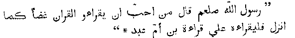 "The prophet of God (on whom be blessing and peace) 'said, 'Let him who wishes to read the Quran as it was sent down, read according to the reading of the son of the mother of Abd (i.e., Abdulla-ibn-Mas'ud)'."