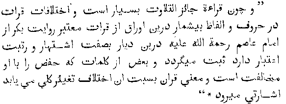 "And as the readings which are authorized to be read are various, and their difference in letters and words innumerable, trustworthy readings according to Bakr, approved by Imam 'Asim, prevalent in this country and reliable, are inserted in these pages (of this commentary). And a few such passages, which, on account of the difference, entirely alter the meaning of the Quran, and opposed by Hafaz, are also referred to."