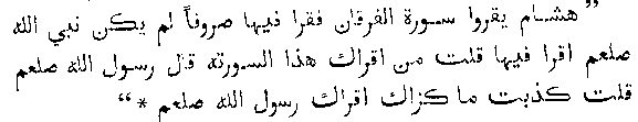 'Umr said, "Hisham read certain verses in Sura Furqan which the prophet had not taught me. I said, 'Who taught you this Sura?' He said, 'The Prophet of God.' I said, Thou liest, the prophet of God never taught it thee thus'." As a matter of fact Islamic history contains many references to the various readings of the Quran. Thus we read that a certain Quran reader named Ibn-Sanabud was once reading the Quran in the great Mosque of Bagdad; but his reading not agreeing with the reading of that place, he was severely beaten and cast into prison, and only released upon his renouncing the reading with which he was familiar. These various readings differed not only in pronunciation, but in a number of cases the whole meaning of the Quranic passage was altered. We now proceed to give a few examples of such passages, which are referred to by Husain, Baizawi and other learned Muhammadan authorities in their writings.