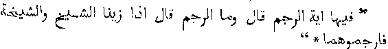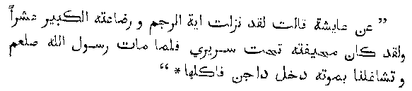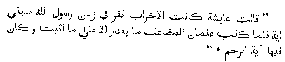 "Ayesha said that the Sura Akhrab which she was reading was incomplete. In the time of the prophet it contained two hundred verses. And when 'Usman wrote the Quran, he accepted nothing except what he found authenticated, and in it was Ayat Al-Rajam." This testimony of the favourite wife of the prophet fully substantiates the statements made above as to the incompleteness of the present copy of the Quran; for whereas Ayesha tells us that in the time of Muhammad Sura Akhrab contained two hundred verses, the present Quran only contains seventy-three. Ayesha further adds her testimony to 'Umr's to the fact that Ayat Al-Rajam once existed in this Sura; but, needless to say, no trace of it can be found in the present current edition of the Quran. Another tradition, recorded in Kitab Muhajarat explains the disappearance of this celebrated verse. It is there recorded that,