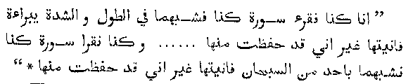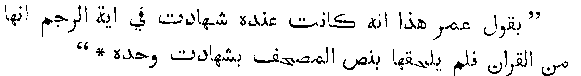 "'Umr said, He had evidence that Ayat Al-Rajam was a part of the Quran; but on his own unsupported testimony he did not (dare to) put it in the book." These traditions show us that the present ideas of the marvellous power of memory said to be possessed by men (Hafiz) of the prophet's day need to be seriously modified; for here we have an undoubted verse of the Quran for the authenticity of which not a single Hafiz could be found to vouch. There is, however, more than one tradition which records the testimony of Ayesha, the favourite wife of the prophet, with reference to this verse. One tradition runs thus,