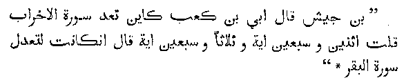 "Ibn-Jish said, Ibn-Kab said, 'How many verses are there in Sura Akhrab?' I said, 'Seventy-two or seventy-three.' He said, 'Sura Akhrab was (once) equal to Sura Bakr'." This well-known tradition is found in the famous work of Jalal-ud-Din Seyuti, known as the Itqan. It tells us that Sura Akbrab, now containing seventy-two or seventy-three verses, was once equal to Sura Bakr which contains two hundred and eighty six verses. Thus it is seen that from this one Sura alone over two hundred verses have absolutely disappeared.