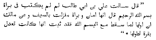 He (Ibn-Abbas) said, 'I asked Ali-ibn-Abi Talib, why was hot the Bismilla written in Sura Barat'. He said, 'Because the Bismilla is for faith, but Sura Barat was sent down for the sword (war). And there is a tradition from Malik that when the first portion of Sura Barat was destroyed, then the Bismilla was lost with it; but if it had been proved, then verily it would have been equal in length to Sura Bakr'."