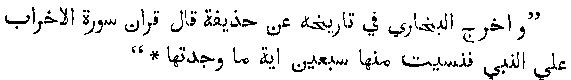 In the history of the famous traditionist Al-Bukhari another tradition affirms the total loss of a large number of verses from Sura Akhrab. It runs as follows,