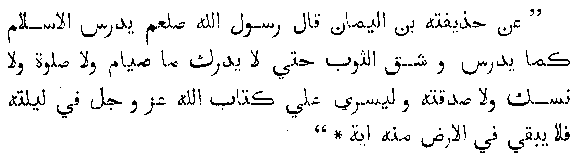 "Hazifta ibn-Iman said, The prophet of God (on whom be blessing and peace) said, Islam will become worn out like the hem of an old garment, until (at last) people will not know what is the meaning of fasting, or prayer, or sacrifice or almsgiving; and in one night the word of God (Quran) will disappear, and not a single verse of it will be left upon the Earth."