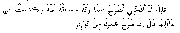"It was said to her, 'Enter the palace,' and when she saw it she imagined that it was a great lake of water, and she uncovered her legs. He said 'verily it is a palace paved with glass.'" Hearing this the Queen replied like any good Muslim, "I resign myself unto God the Lord of all creatures."