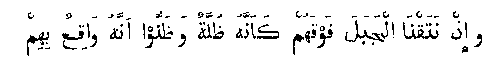 "And when we shook the mountain over them as though it had been a shadow; and they imagined it was falling upon them." This story has no foundation in fact; but it is to be found in a Jewish tract called the Abodah Sarah. The Taurat relates nothing of the kind, but simply states that, while God was giving Moses the Law on mount Sinai, all the people stood beneath, i.e., at the foot of, the Mount. The Jewish commentators, however, soon turned this into a fanciful story of God's holding the mountain over the people; and in the story as found in the Abodah Sarah God is represented as saying to the Israelites, "I covered you over with the mountain like a lid." In another Rabbinical version of the story we read that God "inverted the holy mountain above them like a pot, and said unto them, 'if ye receive the Law, well; but if not, there will your grave be.'" This legend, which was current amongst the Jews of Arabia, must have reached the ears of Muhammad, who, imagining it to be a part of the Biblical story, soon incorporated it into his Qur'an and bade Muslims for all time to believe in it as a part of the word of God, preserved from all eternity near the throne of God in heaven, and finally sent down to Muhammad by the agency of the angel Gabriel.