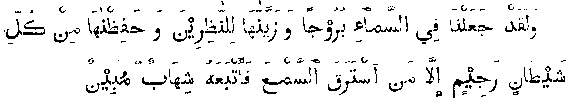 "We have placed signs of zodiac in the heaven, and have adorned them for the spectators; and We guard them from every stoned Satan except such as steal a hearing; and him doth a visible flame consume;" and again, in Suratu'l-Mulk (lxvii. 5) we read:-