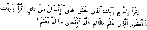 'Recite! in the name of thy Lord who created; - Created man from the clots of blood; - Recite thou! for thy Lord is most Beneficent, who hath taught the use of the pen; - Hath taught man that which he knoweth not.' Then the Prophet repeated the words himself, and with his heart trembling returned to Khadija and said, 'Wrap me up! Wrap me up!' and they wrapped him up in a garment until his fear was dispelled."2
