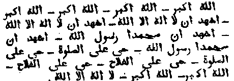 Allahu akbar! Allahu akbar! Allahu akbar! Allahu akbar! Ashhadu an la ilaha illa 'llah! Ashadu an la ilaha illa 'llah! Ashhadu anna Muhammadan rasulu-llah! Ashhadu anna Muhammadan rasulu-llah! Hayya 'ala 's-salati! Hayya 'ala 's-salati! Hayya 'ala 'l-falah! Hayya 'ala 'l-fatah.! Allahu akbar! Allahu akbar! La ilaha illa llah!
