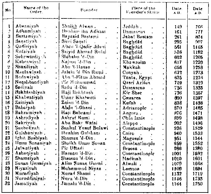 Each century gave birth to new orders, named after their respective founders, but in the present day there is no means of ascertaining the actual number of these associations of mystic Muslims. M D'Ohsonn, in the work already quoted, gives a list of thirty-two orders, but it is by no means comprehensive.