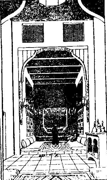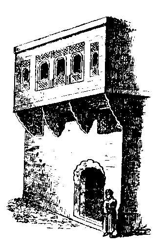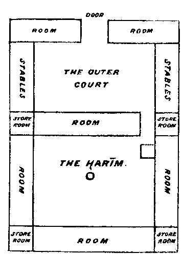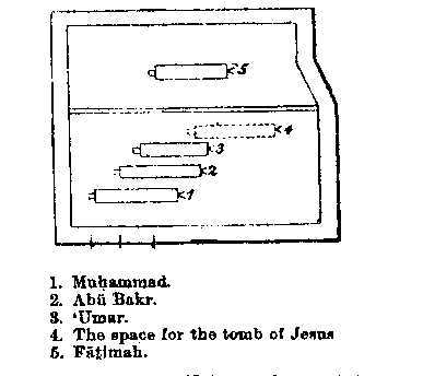 . The "chamber" in which Muhammad died and was buried, which was originally the apartment allotted to 'Ayishah, the Prophet's favorite wife. It is situated behind the Masjidu 'n-Nabi, or mosque, at al-Madinah, and is an irregular square of fifty-five feet, separated from the mosque by a passage of about 26 feet. Inside the Hujrah are supposed to be the three tombs of Muhammad, Abu Bakr, and 'Umar, facing the south, surrounded by stone walls, without any aperture or, as others say, by strong planking. Whatever this material may be, it is hung outside with a curtain, somewhat like a four-post bed. The outer railing is separated by a darker passages form the inner, and is of iron filagree, painted green and gold. This fence, which connects the columns, forbids passage to all men. It has four gates, the Babu 'l-Muwajihah (the Front Gate), the Babu Fatimah (the gate of Fatimah), the Babu 'sh-Sham (the Syrian Gate), and the Babu 't-Taubah (the Gate of Repentance). The Syrian Gate is the only one which is not kept closed, and is the passage which admits officers in charge of the place. On the southern side of the fence there are three small windows about a foot square, which are said to be about three cubits from the head of the Prophet's tomb. Above the Hujrah is the green dome, surmounted by a gilt crescent, springing from a series of globes. Within the building are the tombs of Muhammad, Abu Bakr,, and 'Umar, with a space reserved for the grave of our Lord Jesus Christ, whom Muslims say will again visit the earth, and die and be buried at al-Madinah. The grave of Fatimah, the Prophet's daughter, is supposed to be in a separate part of the building, although some say she was buried in Baqi'. The Prophet's body is said to be stretched full length on the right side, with the right palm supporting the right cheek, the face fronting Makkah. Close behind him is placed Abu Bakr, whose fact fronts Muhammad's shoulder, and then 'Umar, who occupies the same position with respect to his predecessor. Amongst Christian historians, there was a popular story to the effect that Muhammadans believed the coffin of their Prophet to be suspended in the air, which has no foundation whatever in Muslim literature, and Niebuhr thinks the story must have arisen from the rude pictures sold to strangers. Captain Burton gives the annexed plan of the building: