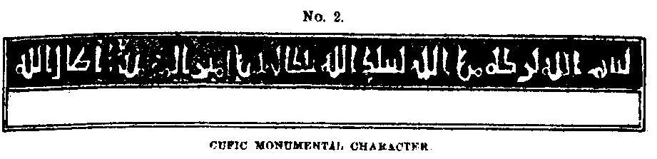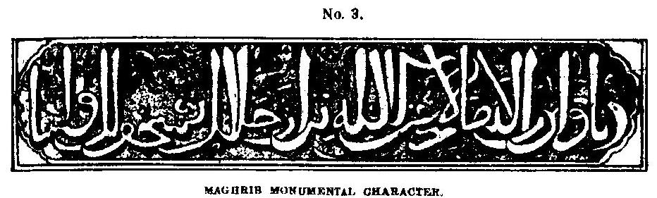 character instead of the superscribed double and single point respectively is the transcript. This is the distinguishing feature between the two styles previously alluded to, and it seems to prove that the use of the diacritical points for these two letters is of late origin, and dates from a time when the two great divisions of the nation had definitely separated and followed each their own destinies. Another point to which we draw attention, is the different form of the Tashdid, as seen in the word Allahr, The Maghrib form is
