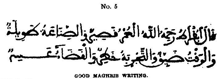 . This tallies with a remark of Hall Khalifah, according to which the diacritical point; of these two letters may be put or omitted ad libitum; and we seem therefore justified in concluding that the necessity for their distinction was latest felt and provided for. Hence arises one of the peculiarities which at once mark the difference between the Western and Eastern styles of writing, and which the reader will observe in the next three specimens presenting instances of the Maghrib manuscript character.