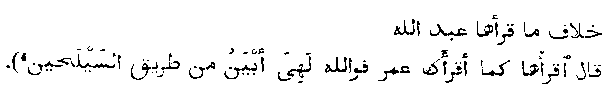 hörte einst einen Menschen in der Moschee den Qoran auf eine ihm nicht bekannte Weise lesen. Er verwarf sie, aber bald darnach machte es ein anderer ebenso. Da ging er zum Propheten, und dieser billigte die Lesart. Als er nun hierüber in Angst geriet und fürchtete, für einen Lügner gehalten zu werden, beruhigte ihn der Prophet durch eine ähnliche Antwort, wie er sie 'Omar und Hischam gegeben hatte1. Hierher gehört auch die unleugbare Verschiedenheit der unter den Gefährten Muhammeds gebräuchlichen Lesarten, von der z. B. - weiteres siehe unten im dritten Teile - folgende Stelle zeugt 2: