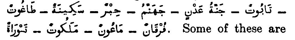If any further proof were needed of the great extent of the influence which Jewish tradition has exerted upon Islam it would be supplied by the very noteworthy fact that, although the Muslims boast of the style of the Qur'an and the purity of its Arabic as a miracle and as an evidence of the Divine origin of the book, yet there are to be found in it certain words which are not properly Arabic at all, but are borrowed from the Aramaic or the Hebrew. Among these may be mentioned: derived from roots common to all three languages, but they are not formed in accordance with the rules of Arabic Grammar, whereas they are of frequent occurrence in Hebrew and Aramaic and properly belong to those languages. The word "Paradise," is taken from late Hebrew, but has come from old Persian, and belongs to that language and to Sanskrit. It is as foreign to Arabic as the same word is to Greek. Muhammadan commentators have often found it impossible to give the exact meaning of such words, through their ignorance of the languages from which Muhammad borrowed them. When we know their meaning in this way, we find that it suits the context. For example, it is a common mistake to imagine that (malakut) denotes the nature or the abode of the angels, since it is not derived from (malak) "an angel," but is the Arabic way of writing the Hebrew (malkuth) , "kingdom." Not less noteworthy is the influence which the Jewish form of worship has had upon that of the Muhammadans. It would be a mistake doubtless to suppose that the Muhammadans borrowed from the Jews their practice of worshipping with covered heads, that of separating the men from the women in the mosque (when the latter are allowed to take part in public worship at all), and of removing their shoes. All these were probably the customs of the Arabs as well as of other Semitic nations from the earliest times. It is much more probable that the ceremonial ablutions of the Muslims were imitated from those of the Jews, though here there is room for doubt. The practice of worshipping towards Jerusalem was, as we have seen, for a short time adopted by the Muhammadans in imitation of the Jews, though ultimately Mecca was substituted as the Qiblah. We have also learnt67 that the observance of a fast-month was derived not from the Jews but from the Sabians. Yet in connexion with that fast there is a rule enjoined which is undoubtedly of Jewish origin. In Surah II., Al Baqarah, 183, where a command is given in reference to the permission to feast at night during that month, the Qur'an says: "Eat ye and drink until the white thread is distinguishable to you from the black thread by the dawn: then make your fasting perfect till night." The meaning of the mention of the colour of the threads is that the Muslims were commanded to fast from dawn till dark. When the question arose at what precise moment the day began, it was necessary to lay down a rule on the subject, as is done in this verse. The rule is taken from that of the Jews on the same subject, for in Mishnah Berakhoth (i., § 2) the day is said to begin at the moment "at which one can distinguish between a black thread and a white one."