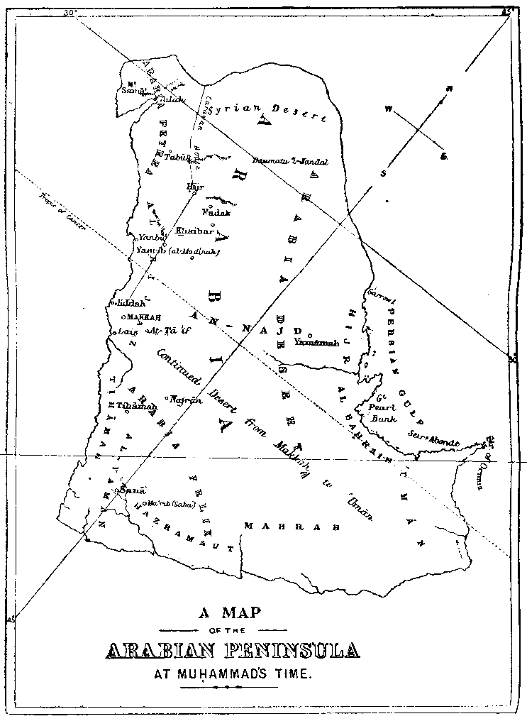 BETWEEN the Red Sea and the Persian Gulf lies a triangular continent, arid and well-nigh waterless, save where the fertility of an occasional flood lends to the scene the freshness and charm of an oasis in the desert. Wild, desolate, bleak, dreary and monotonous, the sandy region of Arabia presents but few features to command interest; yet this land, so unattractive in its nature, so uninteresting in its aspect, has played an all-important part in the history of the world, for it can claim high honour and distinction as the birthplace of the Prophet of Islam - a genius who, whatever may be the verdict of posterity in regard to his "mission," has had a more potent influence on the destinies of mankind than has been vouchsafed to any son of Adam who has left footprints on the sands of time.