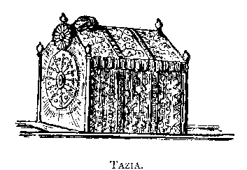 At the time of the Muharram, preparations are made in the various cities of Persia for the celebration of the Miracle play, and large tents, called "takyas," are erected in the streets and open places: these are fitted up with black linen, and furnished with objects emblematical of the events connected with the massacre of Husain and his family on the field of Karbala, the expense being not infrequently borne by some rich man, anxious to conciliate his Creator by such an act of piety and devotion. The ceremonies commence on the 8th of the month, on which day "the Grand Vizier," says Mr. Morier, who himself personally witnessed this strange scene-"invited the whole of the Embassy to attend his takya. On entering the room, we found a large assembly of Persians clad in dark-coloured clothes, which, accompanied with their black caps, their black beards, and their dismal faces, really looked