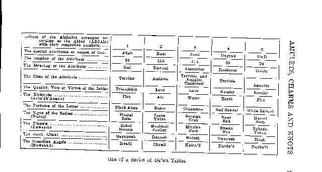 To use the table one takes the initial letters of say Ahmad (A) and Daniel (D) and copies out in double column the result. The future is then read by discerning the agreement or discord of the planets, the elements, the perfumes, etc. In addition to this the perfumes mentioned are burnt during the incantation. This science is almost universally practiced in