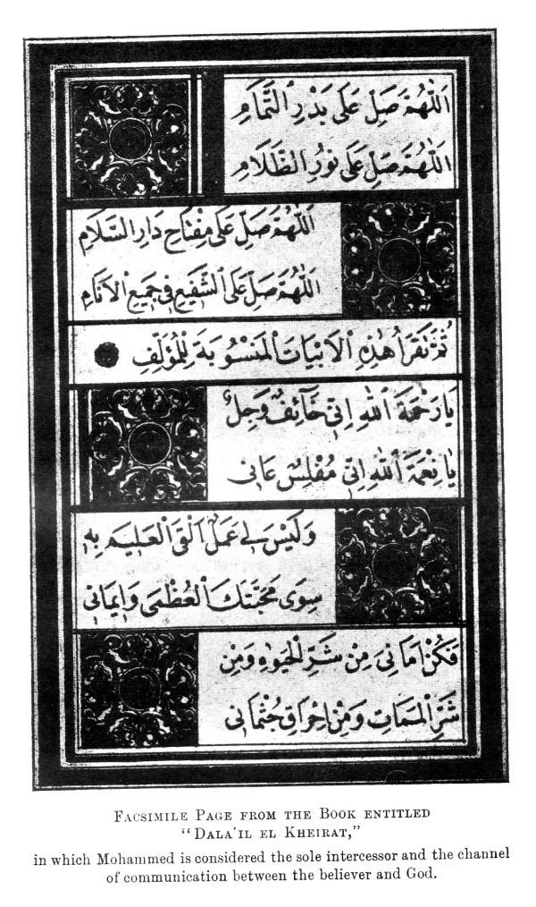 "DALA‘IL EL KHEIRAT."“O God! pray for the Moon of Perfection. O God! pray for the Light that shines in the darkness. O God! pray for the Key to the door of peace. O God! pray for the Intercessor of all humanity! O Thou Mercy of God! (Mohammed) I am afraid and terrified. O Thou Grace of God! I am bankrupt; help Thou me. I have no good work in which I can put my trust, save Thy great love and my faith in Thee. Be Thou my safety from the evil of this life, and in the hour of death, and deliver my body from the fire.”