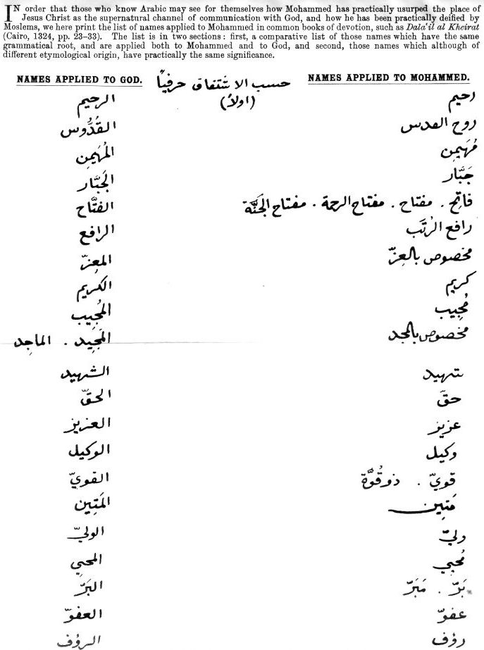 The sin and the guilt of the Mohammedan world is that they give Christ's glory to another, and that for all practical purposes Mohammed himself is the Moslem Christ. The life and character of Mohammed as portrayed for us by his earliest biographers, who were all his faithful followers and admirers, leaves no doubt that he was thoroughly human and liable to error. Later tradition has changed all this, and made him sinless and almost divine. The two hundred and one titles of honour given to Mohammed proclaim his apotheosis. These names and titles are current in all popular books of devotion among Moslems, from Morocco to China; are separately printed and learned by heart in Moslem schools. The list which follows contains at least two score of names that Christians would apply only to Christ, and many of them are by Mohammedans themselves applied to God as well as to their prophet, namely—