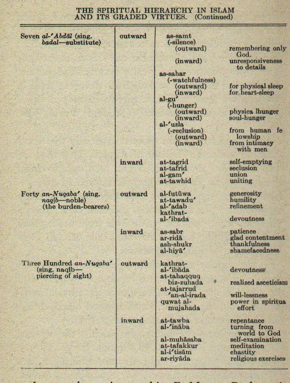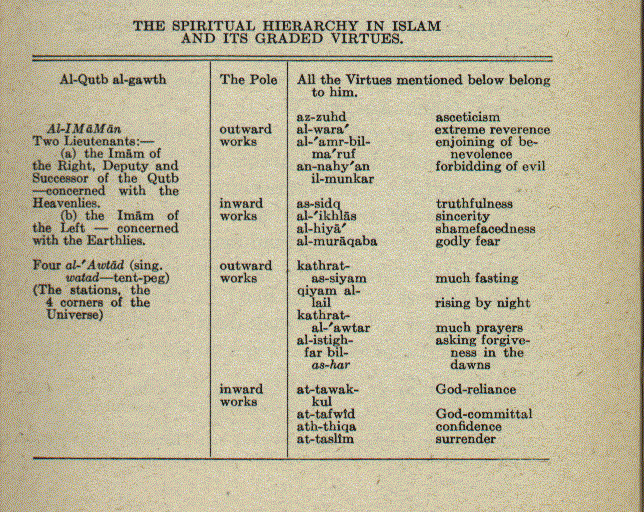 George Swan, writing on Saintship in Islam (The Moslem World, Vol. V., pp. 232 ff.) gave a complete table of the spiritual hierarchy of the Sufi orders, their grades, functions, and spiritual attainments. He is thoroughly acquainted with the whole system in Egypt and has lived close to the people as missionary in the Delta villages. Here is his table: