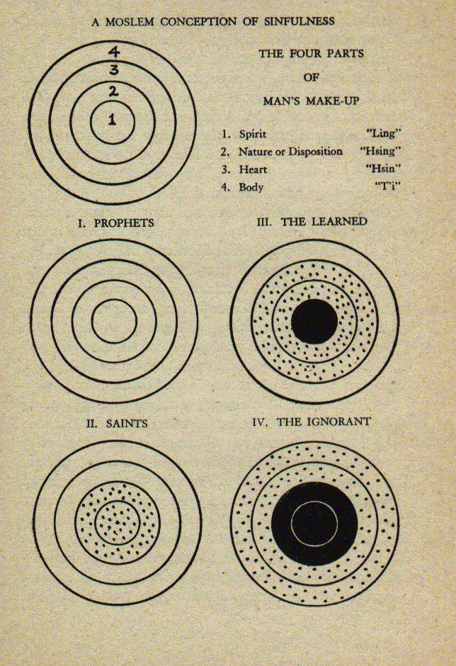A recent example of the popular belief in the superior virtue of saints comes from Yunnan S. W. China: "The diagrams I send," writes Raymond H. Joyce, "are approximate reproductions from those in an Arabic hook shown me by a priest in a mosque. They illustrate the relative degrees of sinfulness of the four classes of persons in the four parts of their make-up: prophets- Sheng Jen, completely clean; saints - Hsien Jen, the